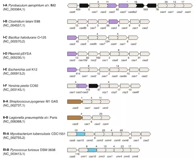 I 型CRISPR的標(biāo)簽基因是Cas3(紫色)。在不同的物種中,又將I 型細(xì)分為6個亞型(I-A-E),圖3。