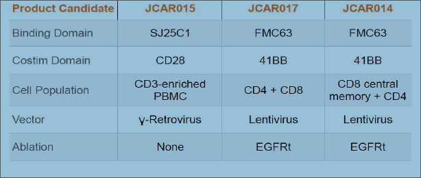 Juno Therapeutics (JUNO)則與上述的三家醫(yī)學(xué)機(jī)構(gòu)合作。在2016 6月ASCO上報道的臨床研究中,51名復(fù)發(fā)或難治性(r / r)急性淋巴細(xì)胞白血?。ˋLL)成年患者用環(huán)磷酰胺或氟達(dá)拉濱/ 環(huán)磷酰胺,然后輸注JCAR015。隨訪研究觀察到90%的完全緩解率(CR)。然而在同年7月6日,JCAR015在Ⅱ期臨床試驗中導(dǎo)致2例患者腦水腫死亡而被叫停。JUNO認(rèn)為是由于CAR-T治療前用藥氟達(dá)拉濱引起。但是去除氟達(dá)拉濱后繼續(xù)臨床試驗,11月23日又出現(xiàn)了三個腦水腫死亡病例,JUNO不得不終止JCAR015臨床試驗,痛失了在CAR-T的領(lǐng)先地位。JUNO將其重心轉(zhuǎn)向其它產(chǎn)品,JCAR17 和 JCAR14等。它們的區(qū)別見圖9。