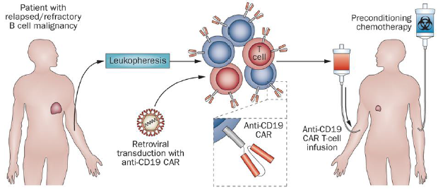 針對CD19、CD20和CD22為靶抗原的CAR-T細(xì)胞治療B細(xì)胞惡性腫瘤研究較多, 原因就是即便損傷了成熟B細(xì)胞, 也只是暫時的、可恢復(fù)的。美國賓州Hershey女孩 ,Emily Whitehead 患有急性淋巴細(xì)胞白血病(ALL),治療靶點為CD19。