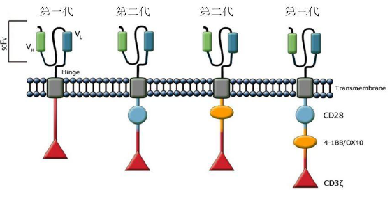 細(xì)胞內(nèi)信號轉(zhuǎn)導(dǎo)區(qū)主要為CD3ζ或FcεRIγ含有免疫受體酪氨酸活化基序(immunoreceptor tyrosine-based activation motifs, ITAM,)以及第二刺激信號CD28或者其它分子,4-1BB, OX40等正向協(xié)同刺激信號。根據(jù)CAR結(jié)構(gòu)的進(jìn)化,有第一代,第二代和第三代。幾代CAR-T的區(qū)別在于細(xì)胞內(nèi)信號轉(zhuǎn)到區(qū)連入了不同的正向協(xié)同刺激信號:第一代CAR(左)由單鏈抗體通過跨膜區(qū)域與胞內(nèi)信號傳導(dǎo)區(qū)(ITAM)相連, ITAM通常為CD3ζ或FcεRIγ; 第二代CAR(中)的胞內(nèi)信號轉(zhuǎn)導(dǎo)區(qū)引入了共刺激分子, 主要為CD28 或4-BB; 第三代CAR(右)同時引入了兩個共刺激分子, 主要為CD28加上4-BB 或OX40。早期的實驗證明了CAR-T 的可行性,然而第一代CAR 只能引起短暫的T 細(xì)胞增殖和較低的細(xì)胞因子分泌,不能提供長時間的T 細(xì)胞擴(kuò)增信號和持續(xù)的體內(nèi)抗腫瘤效應(yīng)。依照T 細(xì)胞活化的雙信號學(xué)說,T 細(xì)胞的激活和增殖需要兩個共刺激信號;第二代、第三代CAR 引入了共刺激分子信號序列,旨在提高T 細(xì)胞的細(xì)胞毒活性、增殖性與存活時間,并且促進(jìn)細(xì)胞因子的釋放。