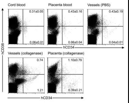 運用流式細胞計數(shù)技術(shù)檢測臍血、胎盤血、血管、胎盤(膠原酶處理后)中造血干細胞(CD34+CD38-細胞)以及造血祖細胞(CD34+CD38+細胞)的含量。胎盤中含有1.1±0.79%的造血祖細胞,含有0.39±0.21%的造血干細胞。與之相比,臍帶血含有0.31±0.05%的造血祖細胞和0.06±0.01%的造血干細胞。胎盤血中含有0.43±0.16%的造血祖細胞和0.06±0.04%的造血干細胞?!猂obin C et al. Human placenta is a potent hematopoietic niche containing hematopoietic stem and progenitor cells throughout development. Cell stem cell.2009 2;5(4): 385-95.