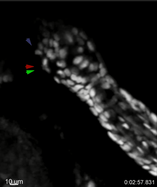 個(gè)別細(xì)胞能逃離得很遠(yuǎn),比如下圖紅色箭頭標(biāo)記的細(xì)胞就遷移了16μm,對細(xì)胞來說可是不短的一段距離了。