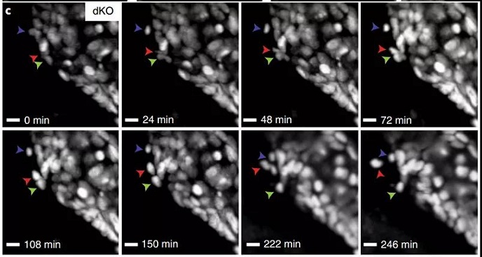 在雙敲除小鼠中,研究者更仔細(xì)地觀察到了干細(xì)胞逃跑的過程。