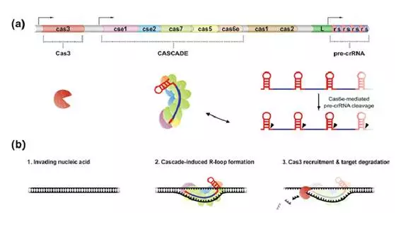 在表達(dá)階段(圖4. a),I 型會產(chǎn)生三個部分:Cas3,Cascade(Cse1, Cse2,Cas7, Cas5和Cas6e的復(fù)合物)和pre-crRNA。Pre-crRNA通過Cascade中的Cas6e來剪切加工獲得成熟的crRNA,并和Cascade繼續(xù)形成復(fù)合物狀態(tài)。