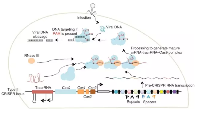 RNase III從spacer的5’端開始剪切,產(chǎn)生不同類型的成熟的crRNA-tracrRNA-Cas9的復(fù)合物;