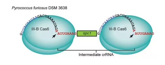 圖9. PrecrRNA經(jīng)過初始加工后,分別形成獨(dú)立中間狀態(tài)的crRNA,之后經(jīng)過3‘端核酸酶的剪切,形成成熟的crRNA。