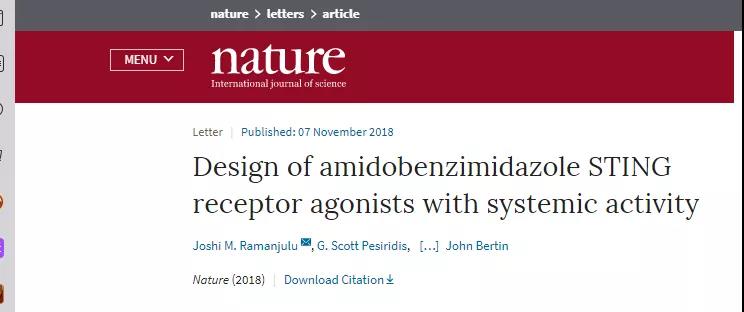 11 月7日,Nature 雜志刊發(fā)了一項最新成果, Joshi M. Ramanjulu 教授等44 名科學家,共同發(fā)現了一種小分子 STING (干擾素刺激基因),這很可能捅破了腫瘤免疫治療的最后一層窗戶紙。