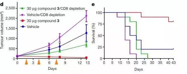 然后,研究人員將新型 STING 蛋白激動劑注入到腫瘤小鼠模型中進行驗證。其最終的結果令所有研究者震驚,這種新型免疫治療藥物大大增強了小鼠機體的適應性免疫作用,產生持續(xù)的抗腫瘤作用,同時兼?zhèn)溆屑せ蠲庖哂洃浖毎淖饔?,腫瘤組織最終完全消退。