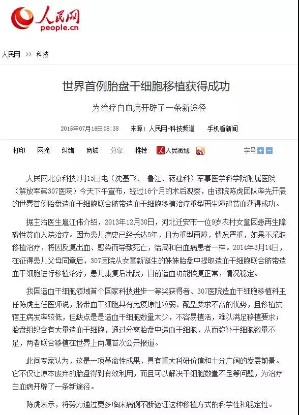 2015年7月16日,解放軍第307醫(yī)院陳虎教授團隊宣布,經(jīng)過16個月的術(shù)后觀察,世界首例胎盤造血干細胞移植治療重型再生障礙貧血獲得成功。