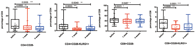研究結(jié)果顯示,NK細(xì)胞輸注后1周和4周,表現(xiàn)為CD28-、KLRG1+的CD4+ T細(xì)胞和CD8+ T細(xì)胞顯著減少。這代表T細(xì)胞衰老指標(biāo)顯著得到改善。