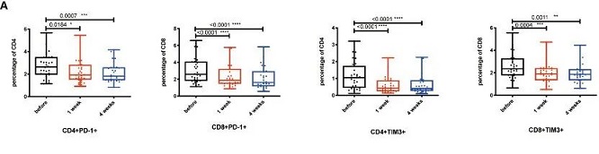 在NK細(xì)胞輸注后1周和4周,流式細(xì)胞術(shù)分析得到的PD-1和TIM-3 T細(xì)胞的百分比