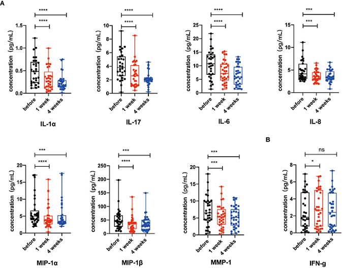 研究結(jié)果表明,NK細(xì)胞輸注顯著降低了包括IL-6、IL-8、IL-1α、IL-17、MIP-1α、MMP-1β以及MMP1在內(nèi)的SASP相關(guān)因子,進(jìn)一步提示NK細(xì)胞輸注能夠有效改善衰老指標(biāo)。